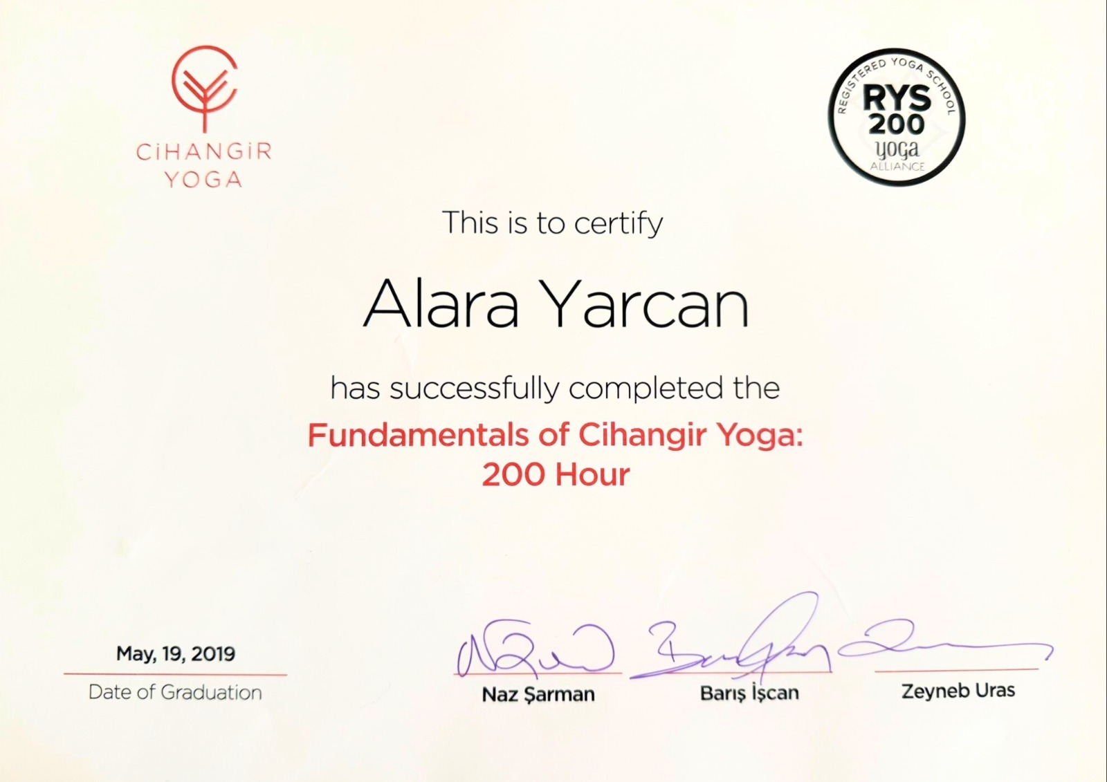 200 Saatlik Eğitim - 2018 Cihangir Yoga’da Zeyneb Uras, Naz Şaman, Barış İşcan’dan alarak tamamladım.